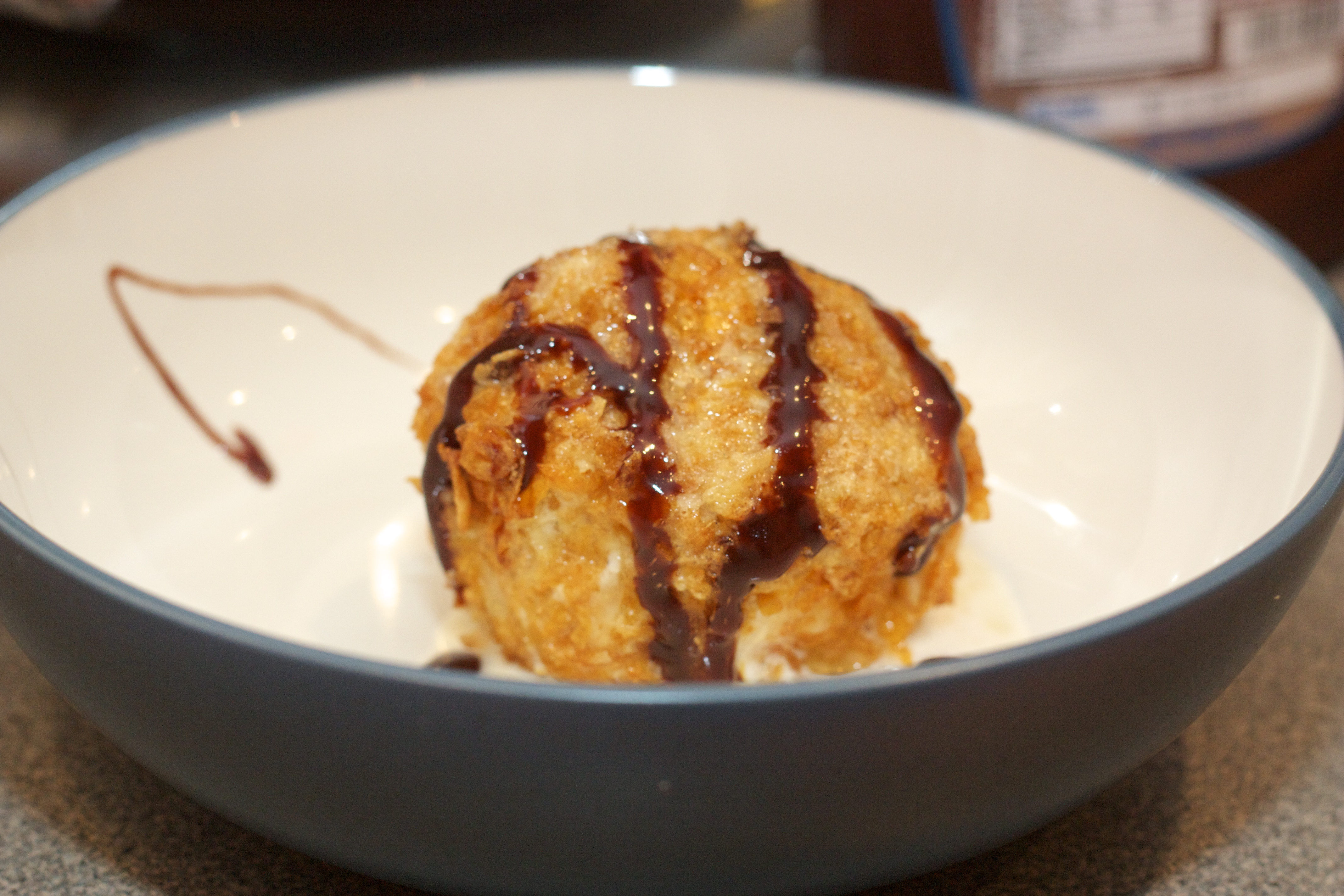 For dessert I decided I wanted to try to make deep friend ice cream. I wanted to do it yesterday, but apparently it takes like 5 hours to prepare. First you have to scoop out balls of ice cream and let them harden in the freezer. Then you dip them in an egg and sugar mixture before rolling them in a coconut and corn flake crust. That then goes back into the freezer to harden before dropping them in hot oil for about thirty seconds.